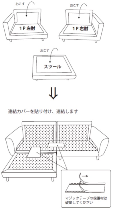 カウチ左右好きな向きにしたり、2P+スツールのタイプに出来ます。自由なレイアウトが楽しめるカウチソファー!さらに、 背・座クッション部分にはフェザーを入れてより良い座り心地に仕上げています」