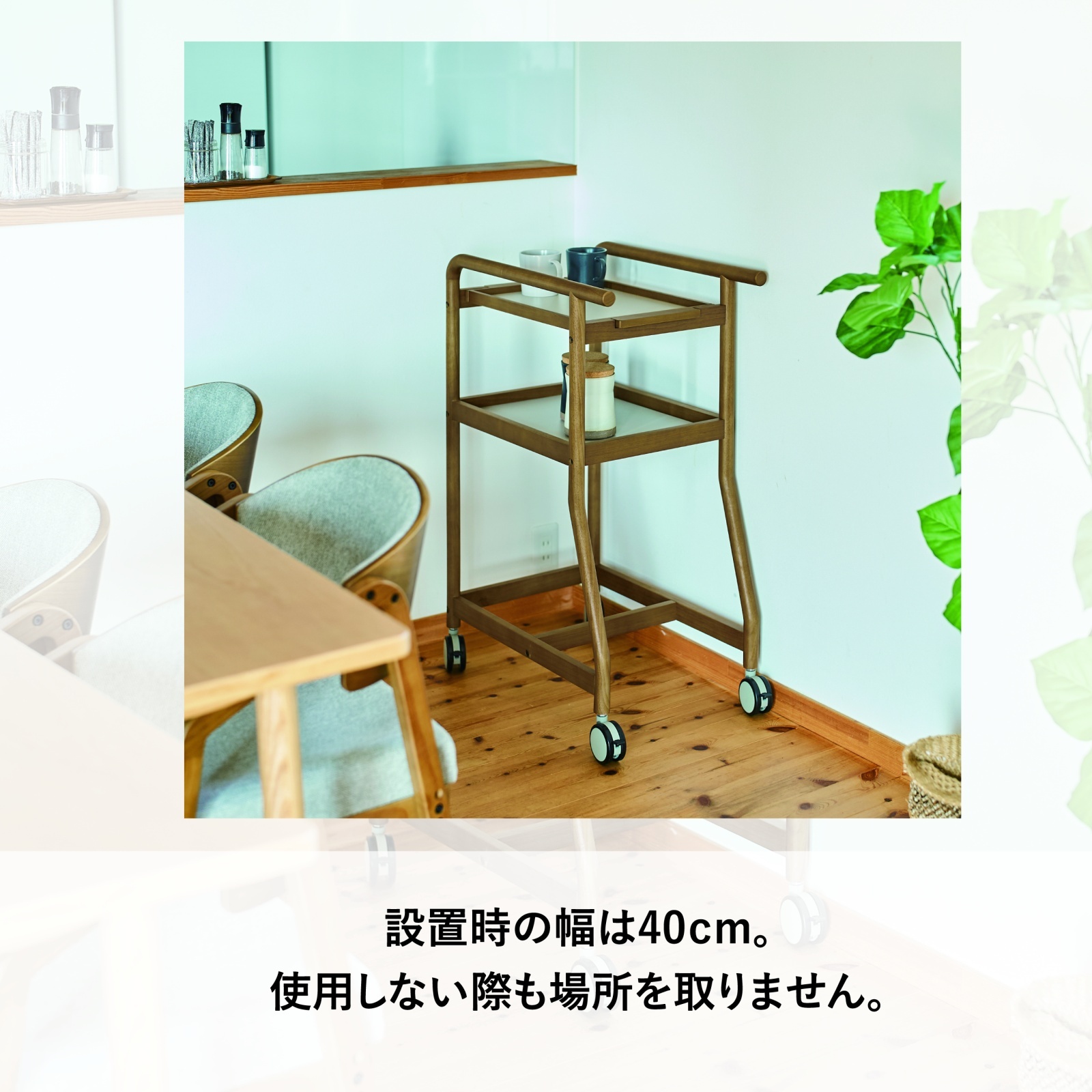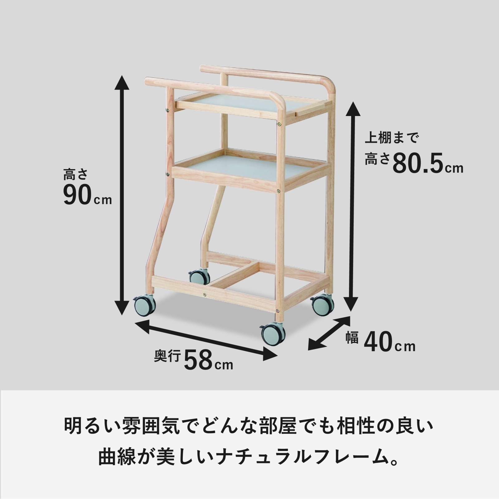 曲線と直線を活かした天然木のフレームが魅力的なワゴン。本体の色はお部屋のインテリアやシーンに合わせてブラウンとナチュナルの2色から選べます。