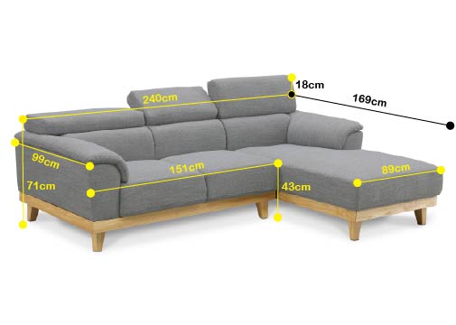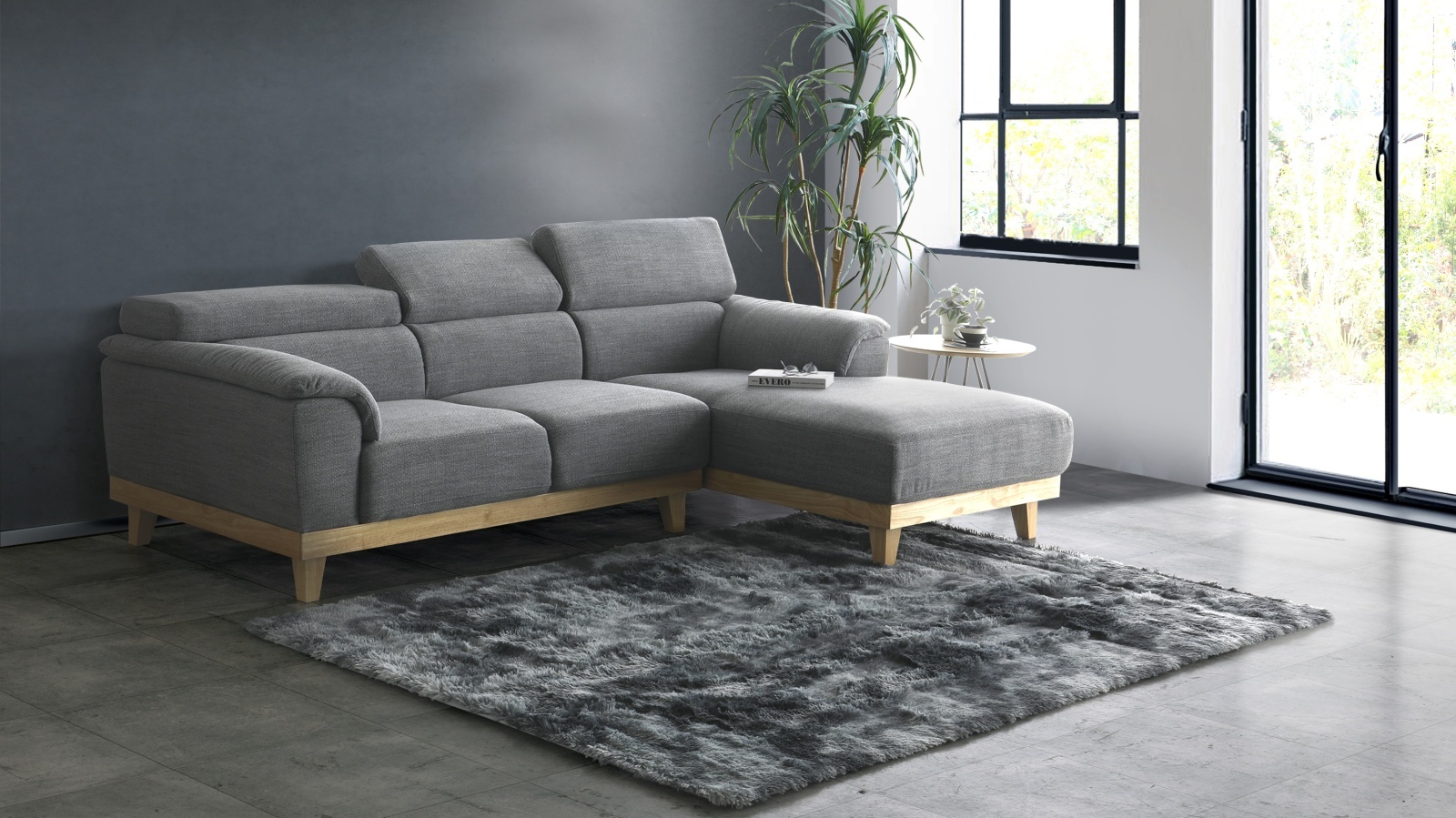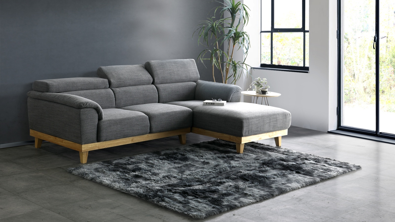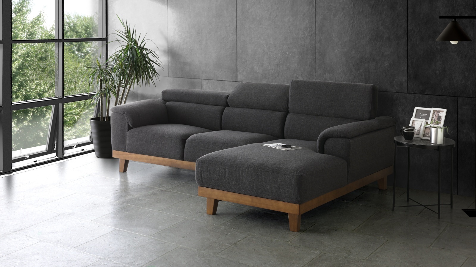 高級感のあるデザインと快適な座り心地を高めたカウチソファ。 ヘッドギア付き可動式で、お好みの角度に調整可能。 座面はバネ+ポケットコイル+ピュアウレタンを採用し、優れたクッション性を実現。 ポリエステル100%のファブリックと天然木のフレームが上質な空間を演出します。 カラーはチャコール・グレーの2色展開。